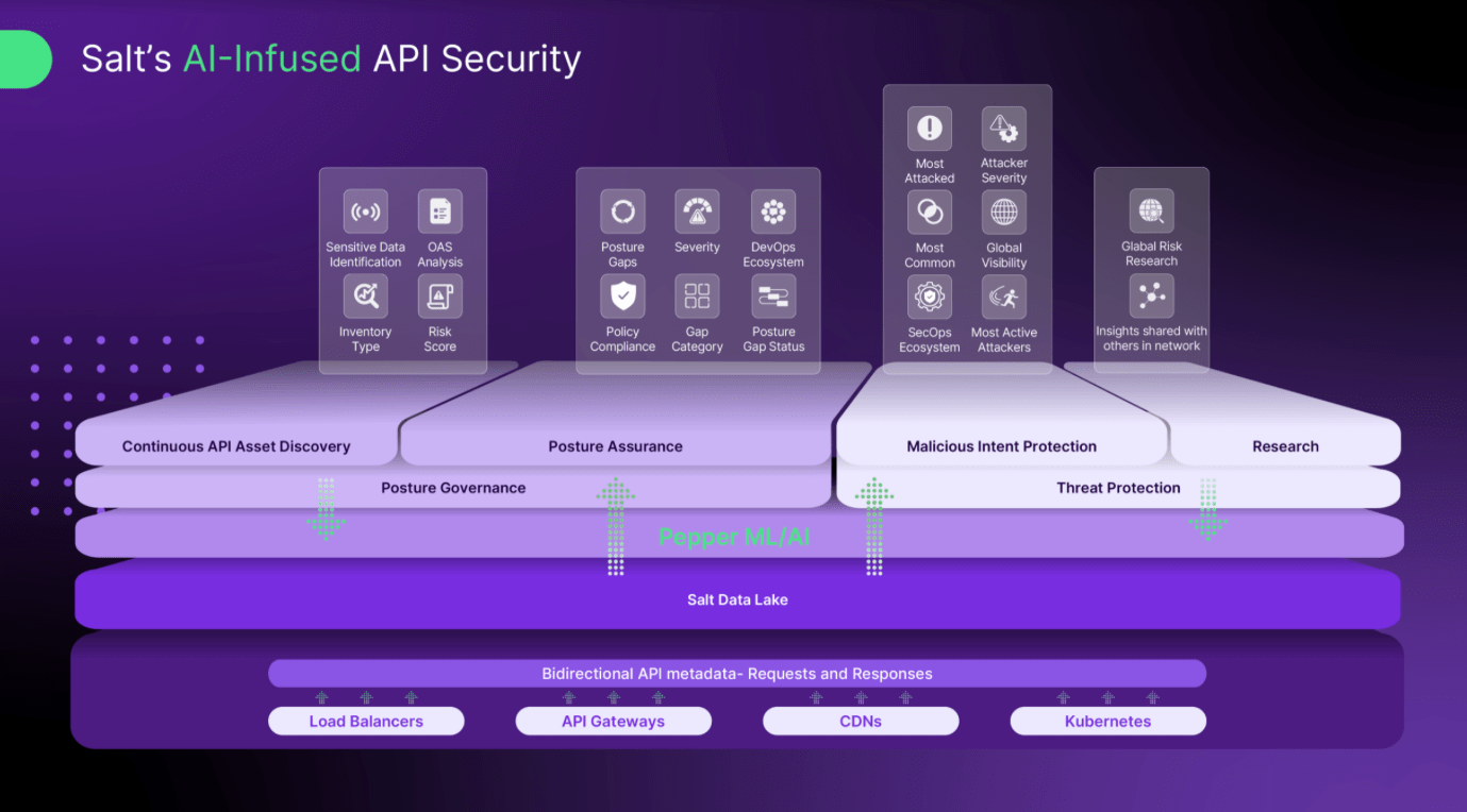 - Salt’s AI engine – called Pepper (as in, salt and pepper) – is used across the Salt platform for continuous discovery, posture analysis, and threat detection. Salt says Pepper is an “exhaustive investigator” in the discovery phase, even finding undocumenting APIs and those embedded in microservices. In the posture analysis / assurance phase, Pepper analyzes for “deviations from security best practices and highlight[s] insecure configurations.” And in the behavioral threat protection phase, Pepper looks for the abnormal, anomalous, suspicious, and potentially malicious exploits and attacks.