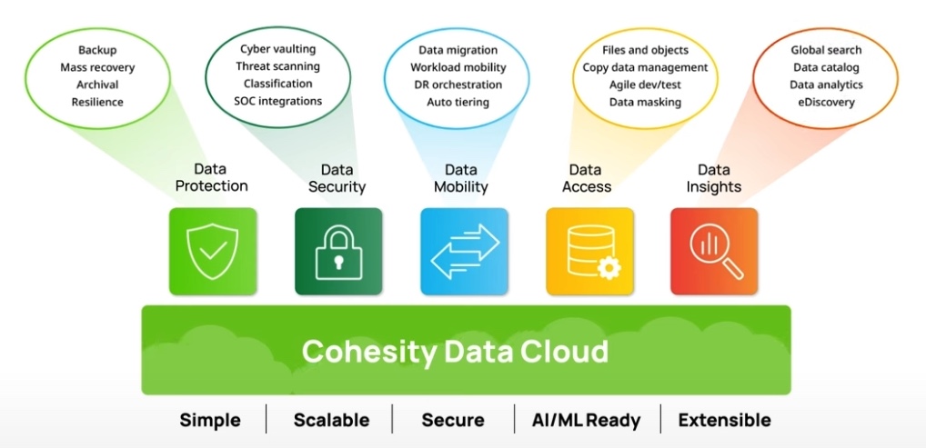 - Cohesity Data Cloud is a service for capturing, managing, securing, and protecting a customer’s secondary data. It includes capabilities for backup and archival, threat scanning, data masking, eDiscovery, and (much) more. Cohesity says that its offer of a unified platform for data management and security reduces costs for organizations by 50% and enables much faster recovery times in the case of a cyberattack.