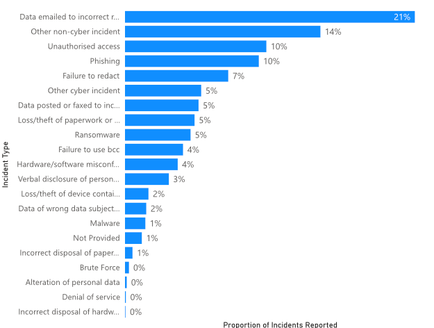 The most common data security incident reported to the Information Commissioner’s Office (UK) for October to December 2024 was … unsurprisingly, misdirected emails. The frequency of using email for communicating with others, the ease of stumbling when using type-ahead addressing in Outlook and other email clients, and the frenetic pace of much office work means that it’s just too easy to choose the wrong person. Of the total incident count reported to the ICO, 21% were of this type.