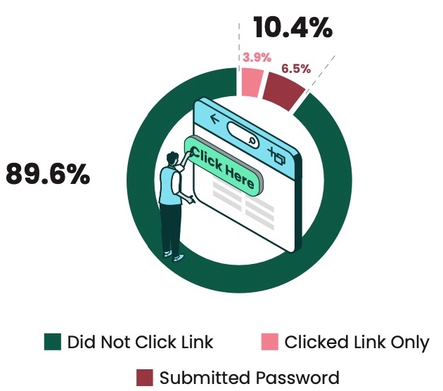 - On receiving the phishing simulation message, 10.4% of all recipients clicked the link. This opened a web page that masqueraded as a valid site and asked for username and password details. Of those who had clicked, 65% entered their details and lost their credentials. Here’s one of the diagrams from the report.