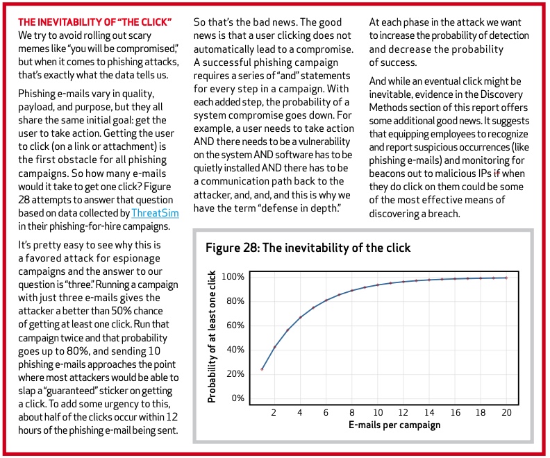 - A decade ago, the Verizon 2013 Data Breach Investigation Report said this about the mathematics of phishing: sending 10 phishing messages almost guarantees a click. Put another way, 10%. Page 38 of the VDBIR 2013 has this box: