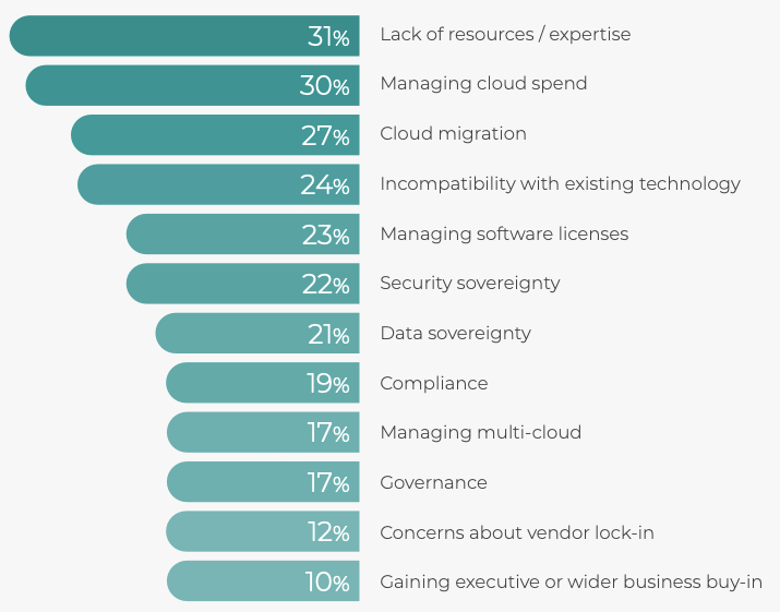 In the cloud adoption section, the following diagram shows the challenges faced with adopting or managing cloud (see page 11 in the report):